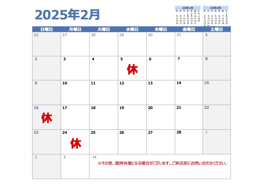 2月休業日のお知らせ 2025年2月1日 最終更新日時 : 2025年2月1日 kiyomoto あくまでも予定となっておりますので、臨時休業となる場合がございます。 ご来店の際は、お手数ですが事前にお電話にてご確認いただきますようお願いいたします。