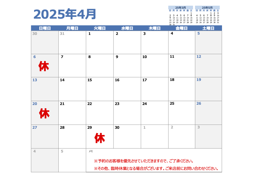 4月休業日のお知らせ